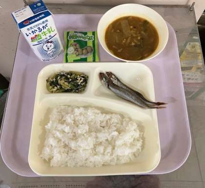 11月17日(月)の給食は、ごはん、牛乳、焼きししゃも、和風カレー汁、ささみとこまつなのいためもの、まっ茶大豆、です。