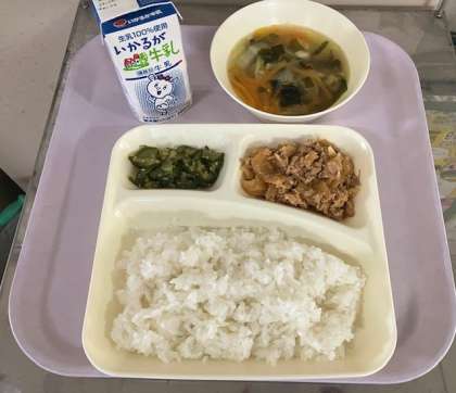 11月19日(水)の給食は、ごはん、牛乳、豚肉のコチジャンいため、鶏肉とはるさめのスープ、きゅうりのナムル、です。