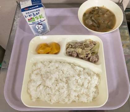 11月25日(火)の給食は、ごはん、牛乳、豚肉と野菜のいためもの、いわしのつみれ汁、かぼちゃういろう、です。