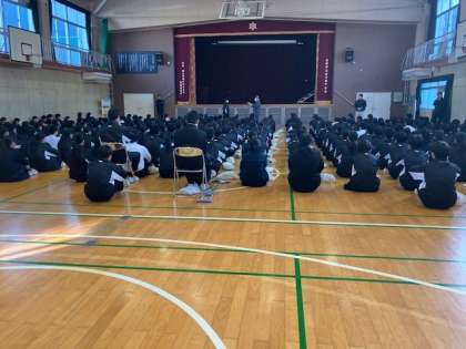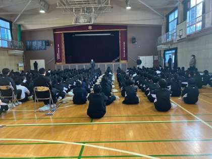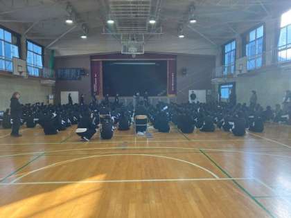 12月1日(月)の全校集会の様子です。今日はインフルエンザ予防のためや、振替休日のために2週間ぶりの全校集会になりました。久しぶりなので、少し集合状態は良くなかったです。