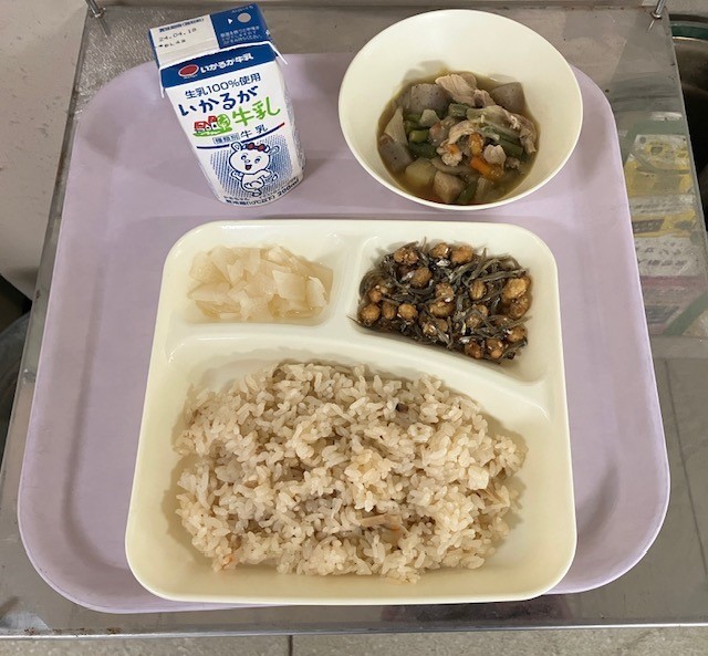 12月8日(月)の給食は、かやくご飯、牛乳、鶏肉と野菜の煮もの、じゃこ豆、かぶのゆず風味、です。