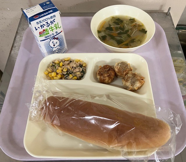 12月17日(水)の給食は、黒糖パン、牛乳、焼きシューマイ、中華スープ、ツナとチンゲンサイのいためもの、です。