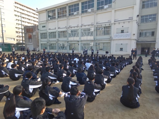 1月16日(金)、技術室から火災が発生した想定で、避難訓練が行われました。淀川消防署の方にも来ていただき、運動場へ避難する様子を見ていただきました。お話では、「中学生には地域の中でお年寄りや子供を助ける力になってもらいたい」とお話いただきました。