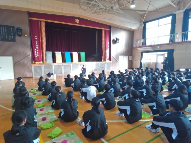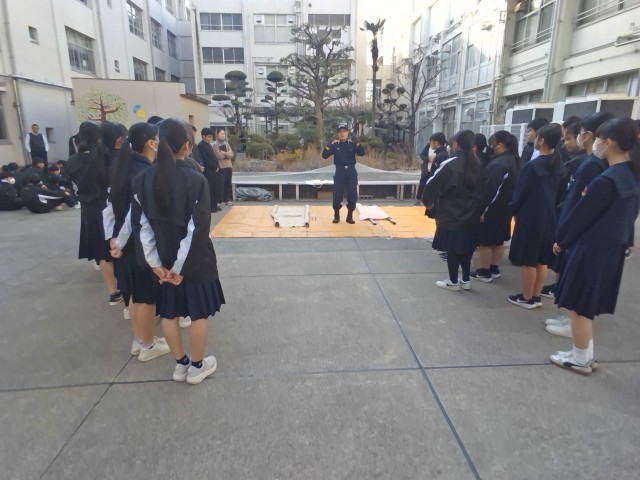 淀川消防署の皆さんから、1年生は水消火器を使った消火訓練、2年生は体育館で「あっぱくん」を使って胸骨圧迫の練習、3年生は簡易担架スマートムーバーと毛布を使用した簡易担架の指導をしていただきました。今日教えてもらったことをいざという時に活用してください。