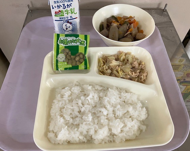 1月23日(金)の給食は、ごはん、牛乳、筑前煮(ちくぜんに)、ツナとキャベツのごまいため、まっ茶大豆、です。