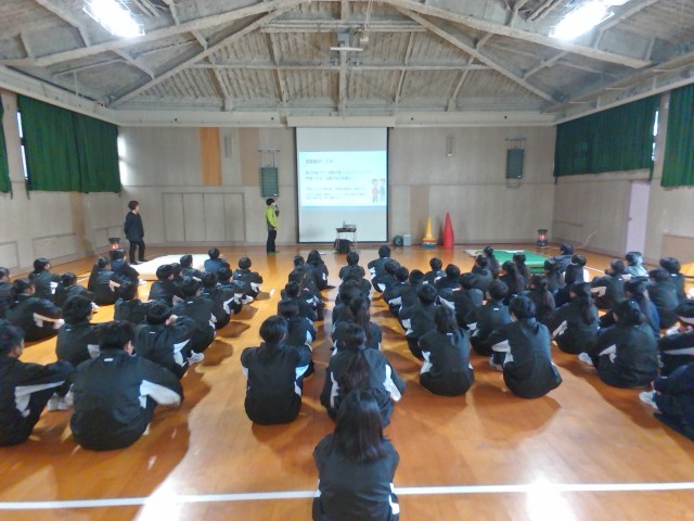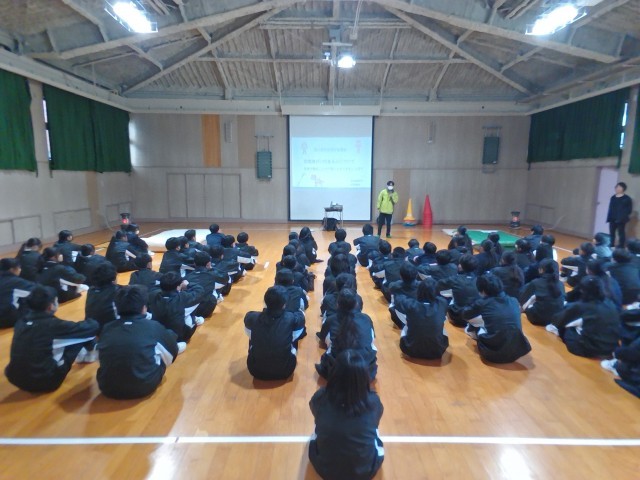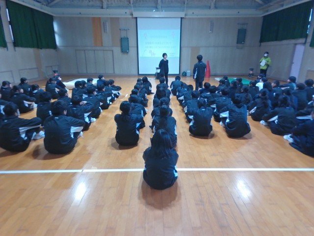 白杖やアイマスクを使った体験学習が終わると、格技室に集合し、淀川区福祉協議会様から視覚障がいについてのお話をしていただきました。全盲だけでなく、視力の弱い方もおられます。困った時にどのように行動したらいいか、教えていただきました。また、この日の感想を各クラス2人ずつランダムに指名して発表してもらったのですが、全員自分の意見や感想をしっかり伝えることができました。今日の体験したことをこれから活かしてもらいたいです。