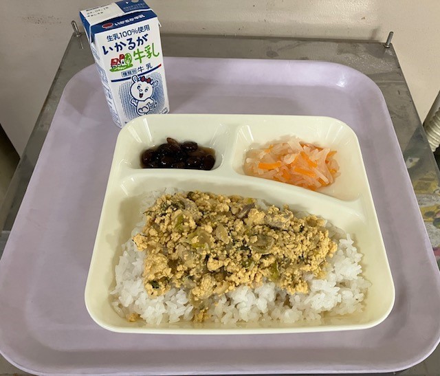 1月27日(火)の給食は、ごはん、牛乳、親子丼、紅白なます、黒豆の煮もの、です。