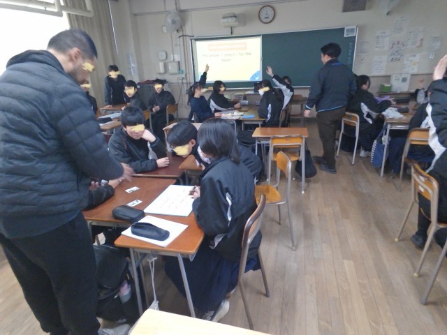 木曜日はC-NET(Osaka City Native English Teacher)が来られ、一緒に英語の授業をします。ひと月に学年をローテーションしていきます。今回、2年生の英語の時間の様子です。c-NETが示したキーワードから文章を作成し、早い班から文章ができていたらポイントを取ることができます。とても盛り上がりました。