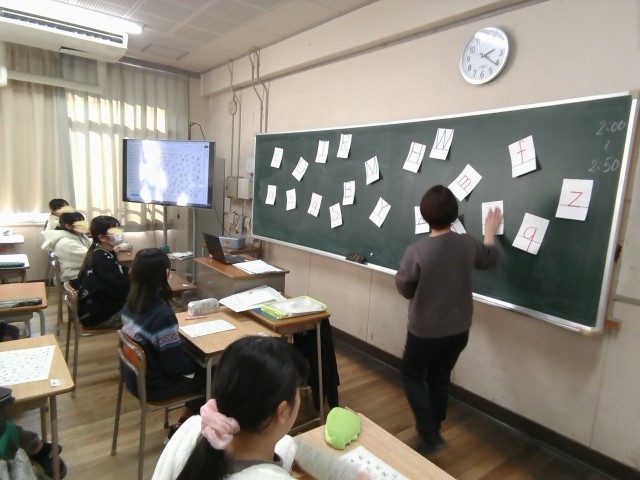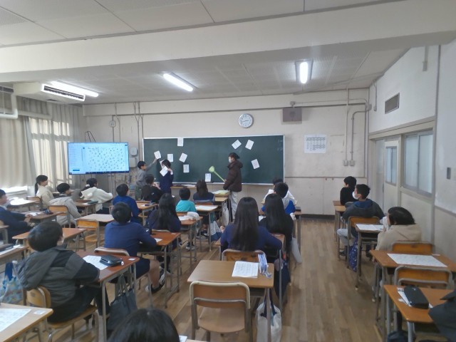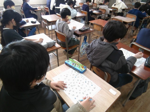 小中交流交歓会、英語の授業の様子です。アルファベットのフォニックス(発音)を学習した後、担当教諭が発音するアルファベットを”ハエ叩きの棒”を使って取り合うチーム戦を行いました。こちらも最初は緊張した面持ちでしたが、楽しかったのか2ゲーム行いました。後半ではアルファベットのカードを取る”ハエ叩きの棒”の音が大きくなっていました。