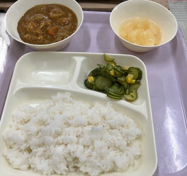 2月13日(金)の給食は、ごはん、チキンレバーカレーライス、牛乳、きゅうりとコーンのサラダ、洋なし(カット缶)、です。