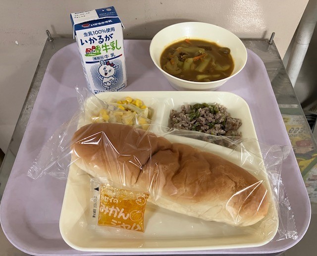 3月4日(水)の給食は、コッペパン、みかんジャム、牛乳、豚肉の香味焼き、カレースープ、カリフラワーとコーンのサラダ、です。