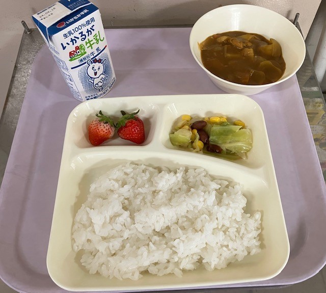 3月10日(火)の給食は、ごはん、牛乳、チキンカレーライス、金時豆と野菜のサラダ、いちご、です。