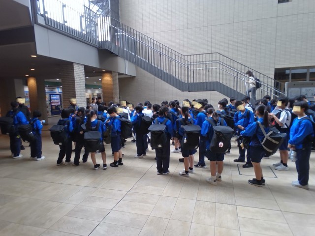 あいにくの雨になりましたが、入学しての初めての学年行事「一泊移住」です。格技室に集合して出発式です。