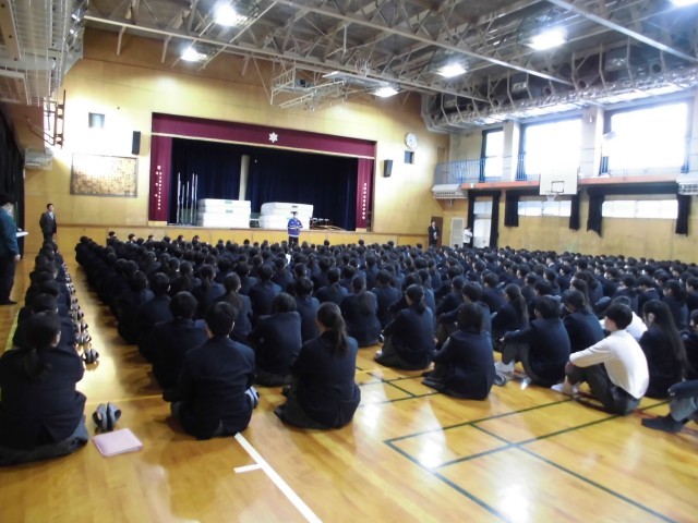 学年・学級休業が続いていたため、久しぶりの全校集会となりました。生徒指導主事の先...