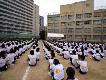 10月2日(予定)の体育大会に向けて、全体練習が始まりました。今日は入場行進の第1回目の全体練習です。さあ、元気よく胸をはって前を向いて歩きましょう!