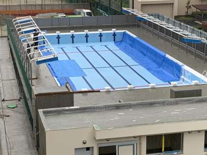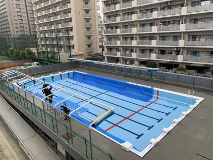 プールの底に紺色のラインと赤のラインが引かれ、プール底の塗装は完了しました。後はテントの取付とプールサイドのモルタル仕上げです。
