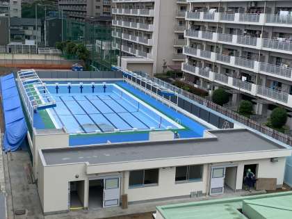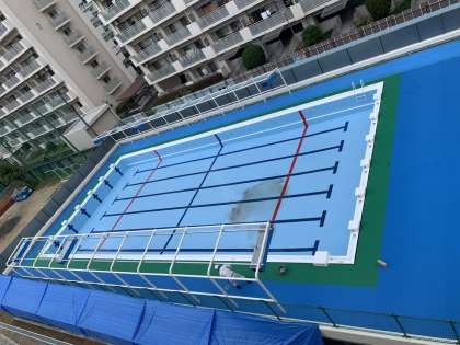 一昨日の土曜日に、プールサイドのモルタルの上に、ブルーとグリーンの滑り止めマットを敷いてプールサイドも完成しました。これで生徒がプールサイドで滑ってケガをすることも軽減できますし、また夏の強烈な日差しでプールサイドが熱くなることも防げます。