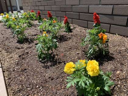 【写真】日差しを浴びて玄関に咲く「サルビア」「マリーゴールド」「ペチュニア」