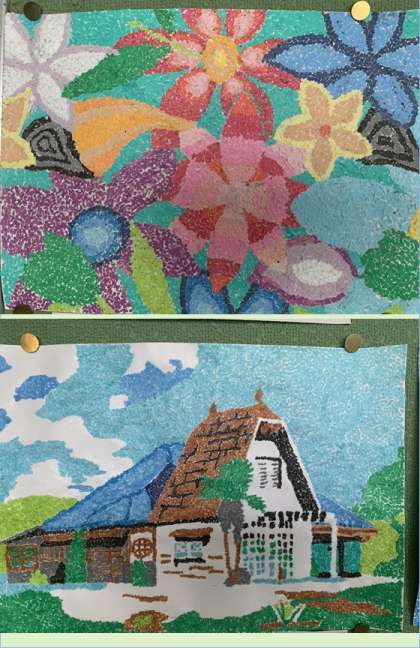 色紙を細かく切って、下絵に張り付ける忍耐力のいる作業の上、完成した作品です。