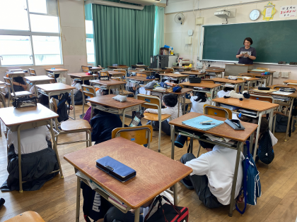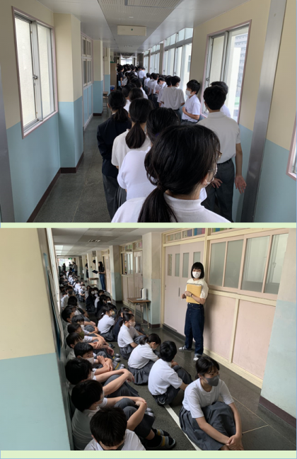 地震と津波を想定した避難訓練を実施しました。地震を想定した訓練では、非常ベルと放送の指示で頭を守るために机の下に隠れました。続いて津波発生の放送が入り、生徒は4階の廊下へ移動しました。生徒は真剣に行動をとり、速やかに人員確認ができました。淀川消防署の方も来られて、放送で高評をしていただきました。
