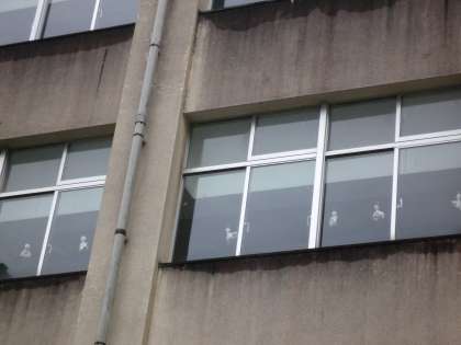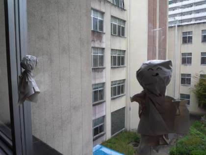 生徒たちが下校した校舎の窓には、可愛いお友達が並んでいました...。本当に明日はいい天気になーれ。