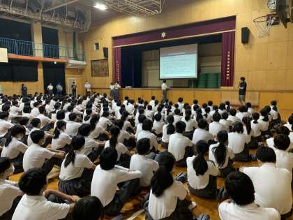 生徒会より、先週31日(木)に参加したブロック生徒会交流会の発表内容を、全校生徒にも伝えました。スマホ依存度と視力の関係についてパワーポイントを駆使してわかりやすく説明をしてくれました。眼科医の先生からのコメントもいただきとても説得力のある内容でした。