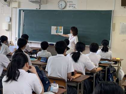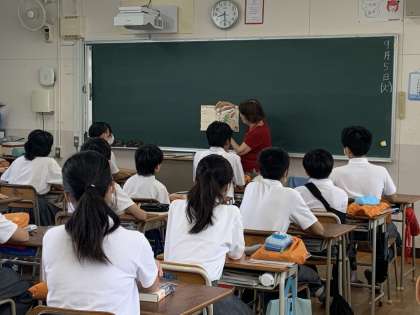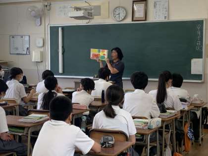 1か月に1回、地域の方に来ていただき、1年生対象に本の読み聞かせをしていただいています。生徒も静かに話を聞いています。