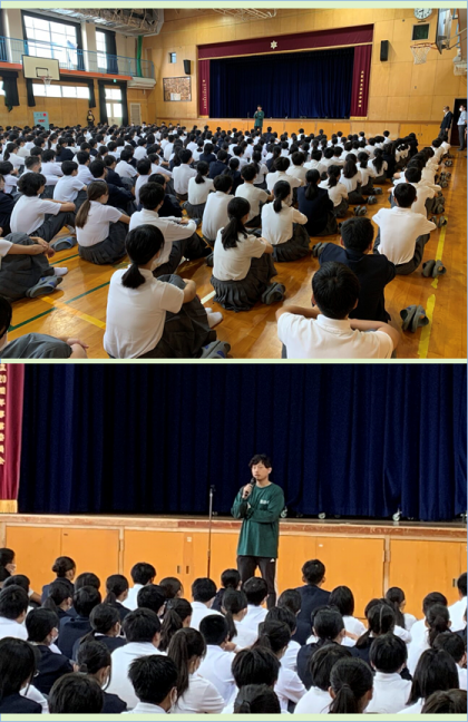 生徒会長から、生徒議会に参加しているメンバー(生徒会役員・各学年代表・各種委員長)を、全校生徒に知って欲しいという思いから、各自で自己紹介をしました。学校・生徒のことを考え、より良くするために議会を開きます。そのためには生徒の皆さんの協力が必要です。