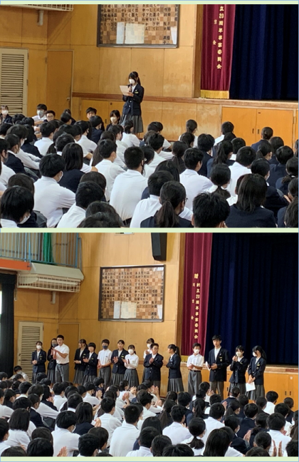 生徒指導主事の先生からは、「評価」についての話がありました。文化発表会に対する評価、今週の中間テストに対する評価があります。他者から見た客観的な評価を受け入れて,成長につなげてください。