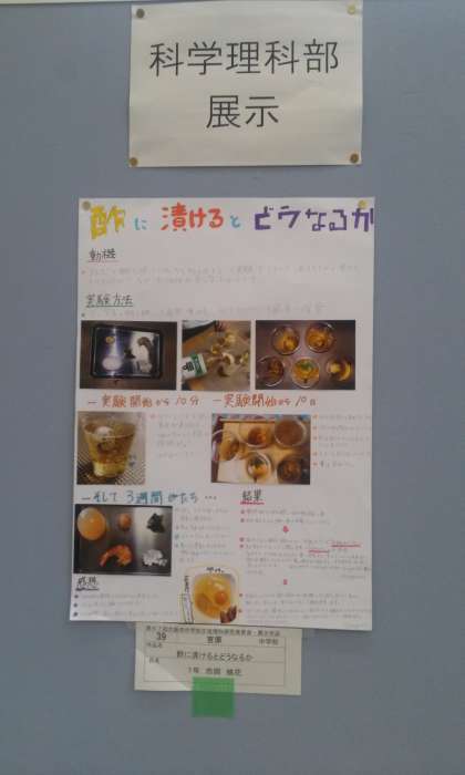 こちらも第67回中学校生徒理科研究発表会で選ばれた、本校生徒の「酢に漬けるとどうなるか」という研究のポスター発表です。
