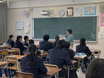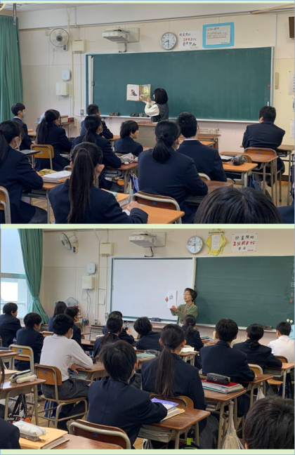 朝から地域ボランティアの方が来てくださり、1年生のために本の読み聞かせをしてくださいました。生徒に絵本を見せながら感情を込めて、お話を読んでくださっています。