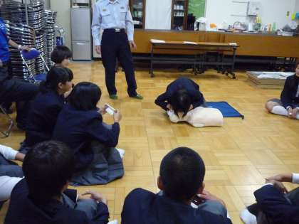 本日の放課後、全学年の保健委員が多目的室に集まって、淀川消防署の方から人命救助のための「胸骨圧迫=心臓マッサージ」と「人口呼吸」、そしてAEDの使い方の講習を受けました。少しの勇気と声掛けで助かる命があることを学びました。