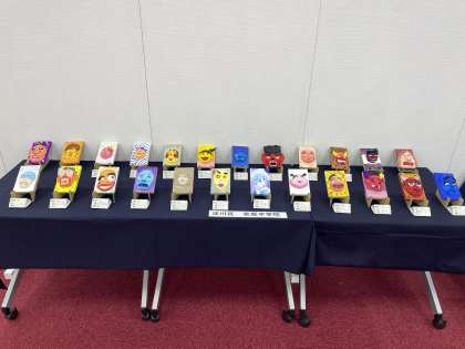 本校からは、1年生が美術の時間に制作した粘土模型「感情仮面」を出品しています。感情「喜・怒・哀・楽・悔・困・驚」に合う表情をデザインした作品を生徒が鑑賞して投票し、デザイン・造形・色など工夫あるもの24点が選ばれました。