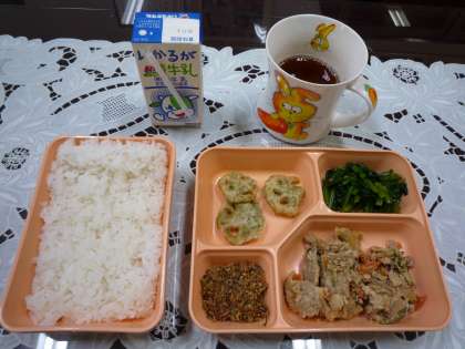 本日のメニューは、豚肉のみそ炒め、れんこんの磯辺揚げ、ほうれん草のおひたし、そして手作りふりかけ(おかか菜っ葉)でした。れんこん、ほうれん草はやや薄味ですが、健康にはいい感じです(^-^)v。