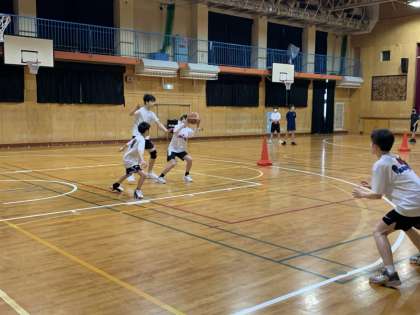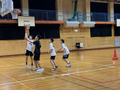 午前中の体育館では、男子バスケットボール部が練習をしています。