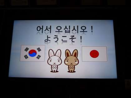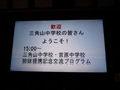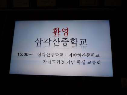 ソウルから来校する三角山中学校を歓迎するため、玄関の大型モニターにこんな画像で準備をしました。三角山中学校の生徒と先生たちは、ごご1時頃到着予定で、校内見学、授業参観をしてもらった後、午後3時より多目的室で交流会を行います。