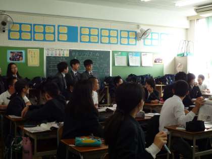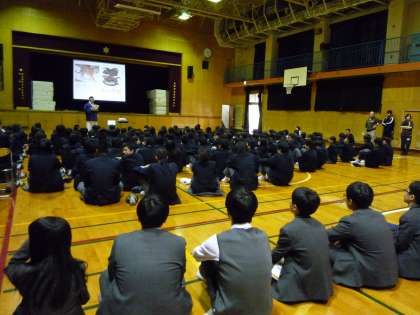 まず、到着後には校内見学と授業参観をしてもらいました。ちょうど、本日は体育館で1年生、2年生を対象にした国際理解教育「日韓関係、文化、歴史」も行われていましたので、その授業にも入ってもらいました。