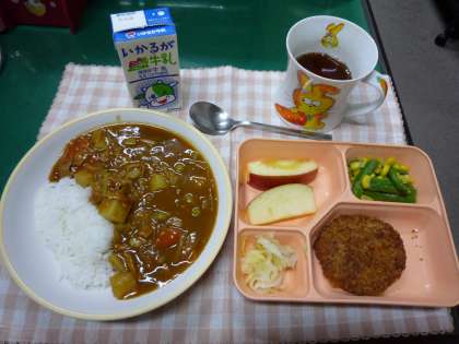 【本日のメニュー】ポークカレーライス、チキンカツ、グリーンアスパラガスとコーンのソテー、キャベツのピクルス、りんご、でした。