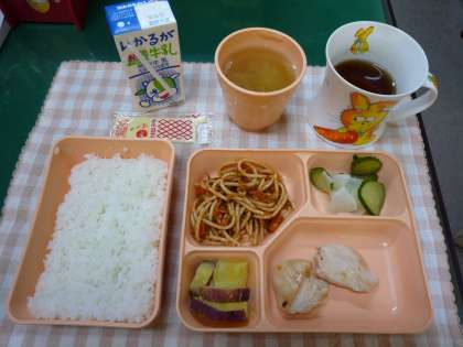 【本日のメニュー】マーマレードチキン、スパゲッティナポリタン、だいこんとキュウリのサラダ、さつまいものバター煮、キャベツとコーンのスープでした。「マーマレードチキン」って、聞きなれない料理ですが、甘みもあって美味しかったですよ。