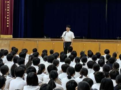 校長先生からは、卓球大会で優勝した学校の生徒たちは技術面だけでなく、大会運営の協力する姿勢のすばらしさについて話がありました。また、今週から始まる学期末懇談で、保護者の方の子どもに対する温かい思いについて話がありました。
