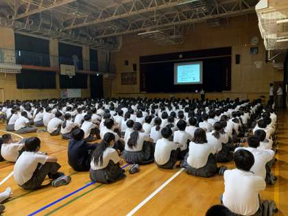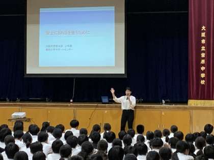 大阪府警本部生活安全部少年課の登尾様に来ていただき、全校生徒対象に中学生の身の回りに起こっている身近な事件について、わかりやすく説明してくださいました。