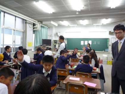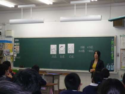 6年1組は清水先生の数学の授業が行われました。小学生に負の数の概念を説明するために、クイズの得点やトランプを使って、グループでゲーム感覚で楽しく学びました。