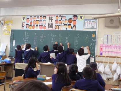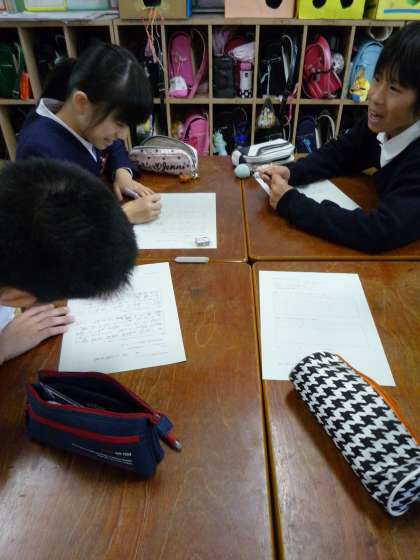 6年2組は橋本先生の国語の授業です。「ウ段」で終わる言葉の説明を受けて、今度は「ぶ」で終わる言葉を探します。「遊ぶ」「尊ぶ」「おんぶ」等に交じって、「ハーブ」「ランデブー」といった外来語も登場しました。グループ代表の生徒が黒板に書いた言葉を、橋本先生が色分けします。動詞と名詞といった品詞のお勉強でした。