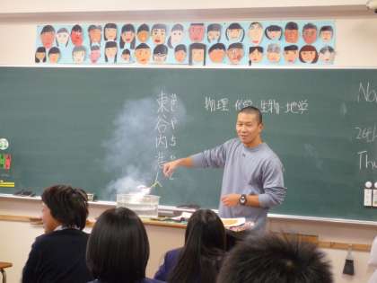 6年3組は東谷内先生の理科です。まずは東谷内先生得意のダンスで自己紹介。クラス代表も前で踊りました。