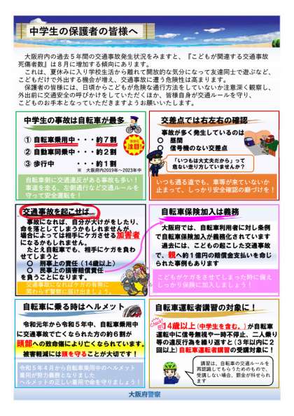 大阪府下の過去5年間の児童生徒の交通事故発生状況は、とりわけ8月にかけて増加する傾向にあるようです。特に中学生は自転車事故が7割を占めています。ご家庭におかれましては、交通事故への注意喚起をお願いいたします。