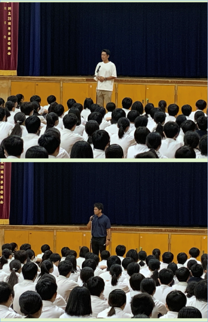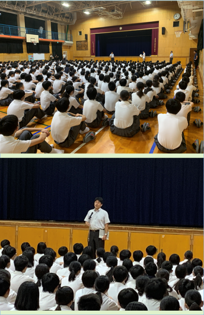 生徒指導主事の先生からは、2学期も「あいさつ」をしっかりしていきましょう。そして、地域に誇れる学校をみんなでめざしましょう。また、悩み事があれば、身近な人(先生・友達・家族など)にそうだんしてください。もし話がしにくい場合は、LINE相談も活用してください。