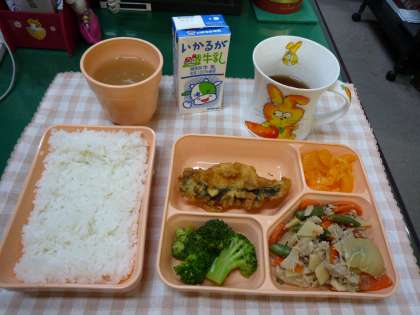 【本日のメニュー】たらのてんぷら、豚肉と野菜の炒め煮、ブロッコリーのごまあえ、みかん缶詰、みぞれ汁、でした。11月最後の給食、白身魚(たら)の天ぷらもおいしい季節です。