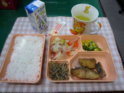 【本日のメニュー】鯵のレモンマリネ、だいこんの洋風煮、チンゲンサイとコーンのソテー、ごぼうサラダでした。レモンマリネはかなり酸味が効いていましたね(>_<)。