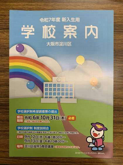 学校選択を希望される方は、10月31日(木)必着で、淀川区役所窓口サービス課へ「学校選択制希望調査票」を提出してください。心からお待ちしています。