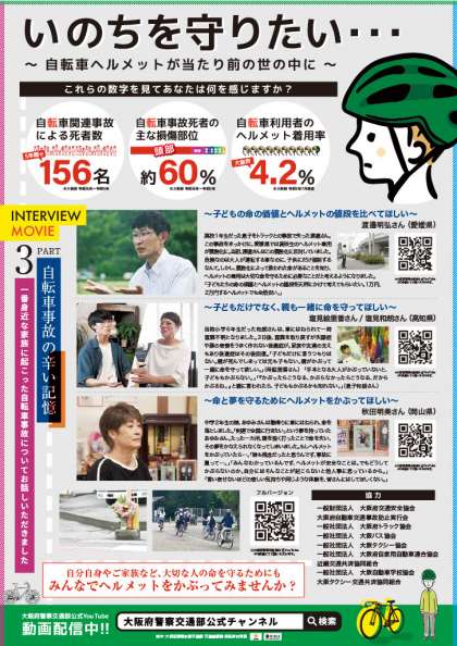 大阪府警察本部交通総務課より、自転車ヘルメットの着用促進啓発動画チラシ(データ)の周知依頼がありました。「いのちを守る」備えを、日ごろから行っておくことの大切さを感じます。